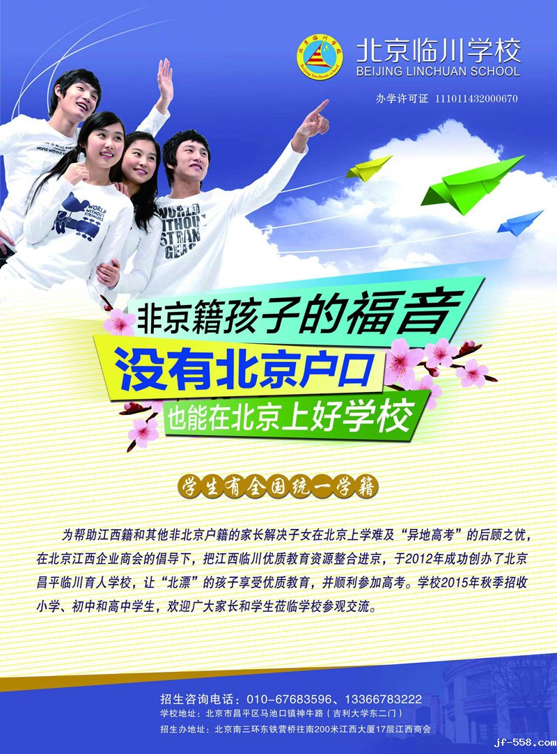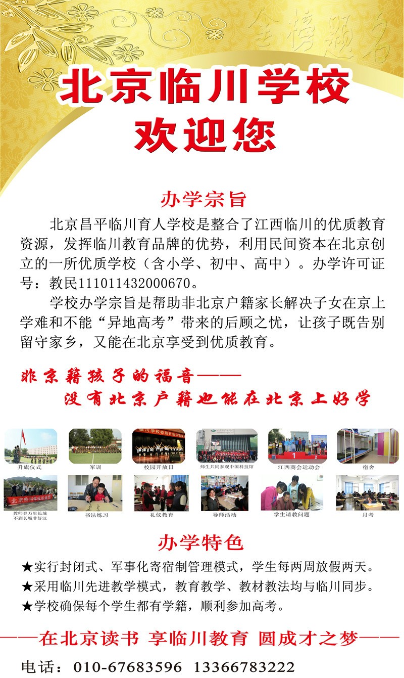 北京临川学校是整合了江西临川的优质教育资源,发挥临川教育品牌的优势,利用民间资本在北京创办的一所优质学校。该校于2012年在江西省人民政府驻北京办事处和betway西汉姆联官方官网的倡导与支持下正式创立,旨在帮助江西籍及其他非京籍家长解决子女在北京上学难及不能“异地高考”的困扰,让孩子既告别留守家乡,又能在北京享受优质教育。